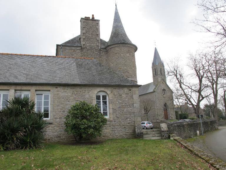 Conçue comme un petit pavillon de château, la mairie école apparaît comme une fantaisie architecturale. De composition très classique, un pavillon central accosté de deux petites ailes basses, la touche néogothique qui peut-être ici qualifié de « style troubadour » est donnée par l’ajout des deux tourelles en façade particulièrement élancées. Cette verticalité est accentuée par la présence d’épis de faîtage. Elle a été probablement dessinée par le même architecte qui construit l’église paroissiale entre 1857 et 1862. Les encadrements en relief des ouvertures ainsi que le bandeau saillant de séparation des niveaux indiquent la présence d’un ancien enduit de finition.