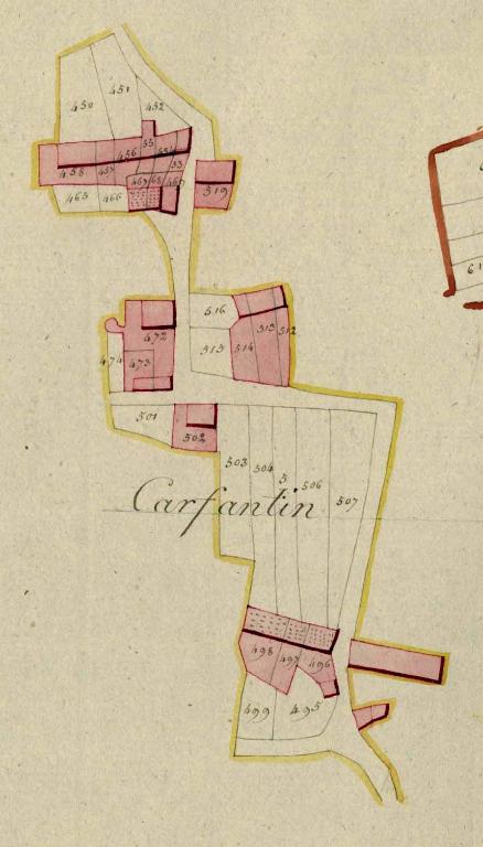 Situé sur la rive sud de la rivière de Guinefort, à proximité de la Cannevatais et du château du Challonge en Trévron, le hameau de Carfantin doit son appellation à son origine bretonne « kerfeunten » qui signifie le village de la fontaine. L’emplacement de celle-ci n’est pas déterminé avec précision, toutefois le cadastre de 1811 signale, au sud du hameau, une fontaine dite de « la Thébaudais ». Les archives ne mentionnent pas la présence d’une chapelle à Carfantin, pourtant une maison de prêtre y demeure au 17e siècle comme le rappelle le livre, le calice et la patène sculptés sur le linteau d’une fenêtre de maison.