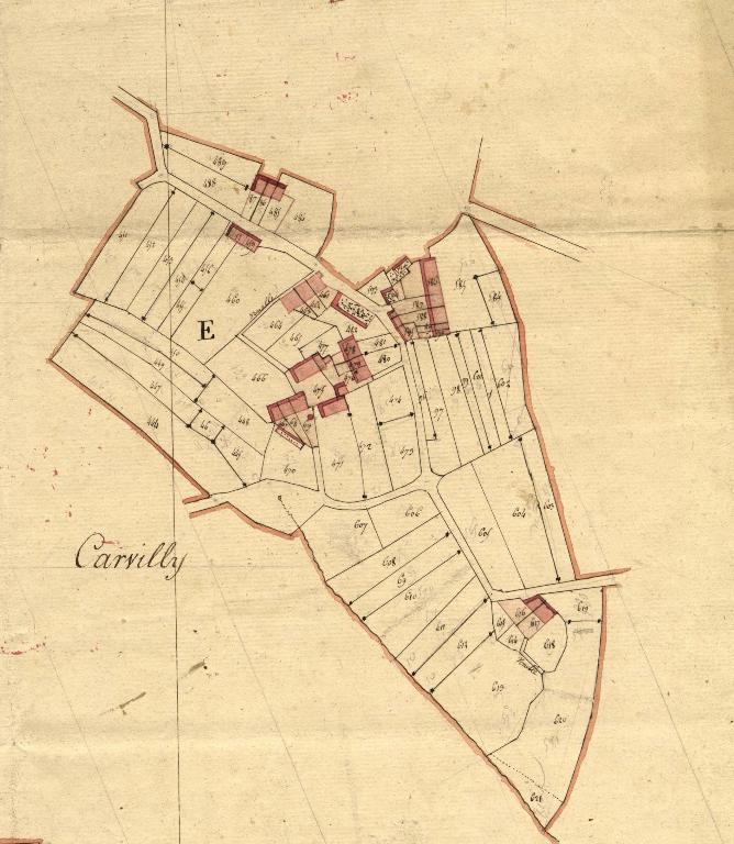 A proximité du ruisseau du même nom, la ferme actuelle de Carvilly à l’écart du hameau serait l'ancienne terre noble appartenant Josselin du Chalonge en 1448. Elle appartient en 1811 à Madame Grarry de Dinan Elle a été transformée au 19e siècle (1837 et dans la deuxième moitié du 19e siècle), mais conserve toutefois la même organisation que celle visible sur le cadastre de 1811 : l’entrée de la cour fermée par un portail, au sud-est la grange attenante à un jardin et les dépendances disposées à l’ouest de la cour. Le logis avec sa dépendance accolée est constitué de deux corps de bâtiments accolés d’inégales hauteurs qui traduisent des campagnes différentes de travaux. L’organisation en travées et les lucarnes de comble avec leurs linteaux cintrés reprennent le style simple en vigueur à cette période.