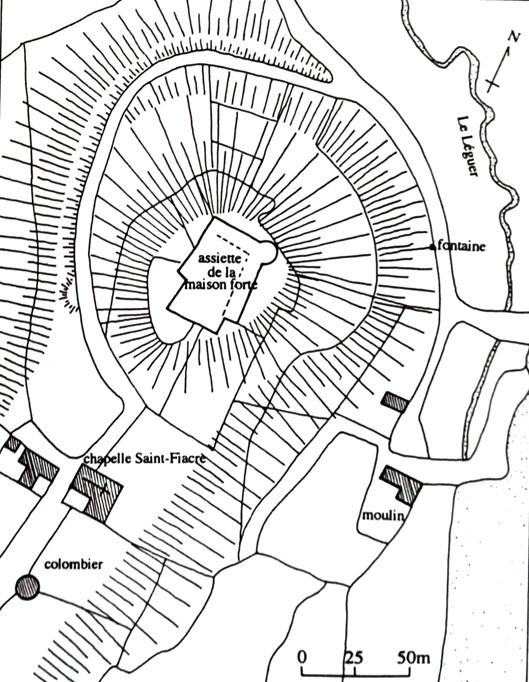 Au sud du château se dresse la chapelle de Saint-Fiacre, une fontaine de dévotion et une demeure et un colombier (ruiné en 1826, situé entre les parcelles n° 614 et 633). Un chemin creux descend de la chapelle Saint-Fiacre au Léguer. En contrebas se trouve le moulin à eau de Kergrist (reconstruit au 18e siècle).
