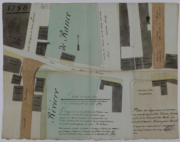 La rue de la Madeleine est une appellation tardive, comme en rend compte un plan de Garengeau daté 1700, ou elle est nommée “le Chemin de Saint-Malo”, pus en 1733, “le Chemin Neuf”. Le tracé routier rectiligne dans la montée qui apparait comme une entaille dans le paysage a été réalisé à partir du milieu du 18e siècle, Le bas de la rue a fait également l'objet d'un plan d'alignement en 1786. La façade de l'ancienne auberge de la Croix Verte, 31 et 33 rue de la Madeleine a été reculée et la façade reconstruite comme le bâti situé aux abords du pont.