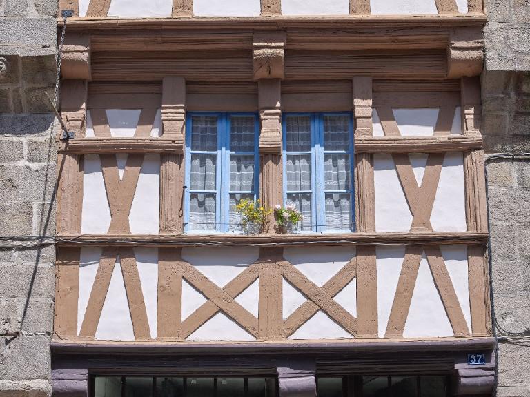 Trois abouts de poutres débordantes supportent l'encorbellement de chaque niveau. Sablières et entretoises sont moulurées, de même que les poteaux principaux. Une lisse haute et basse filante encadrent les fenêtres et se poursuivent sur les parties aveugles. Une croix de Saint-André contrevente les extrémités du premier étage ; une simple écharpe au deuxième.