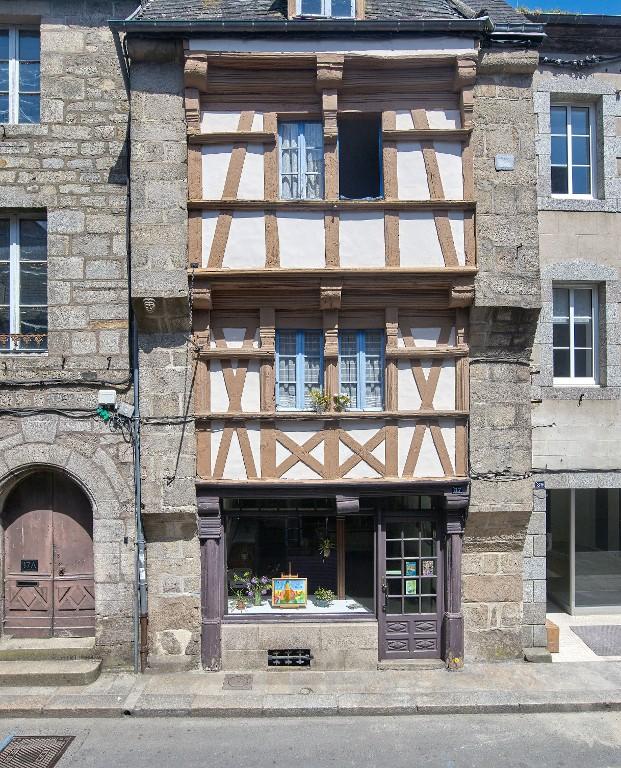 Maison de deux étages à gouttereau sur la Grande Rue. Le pan de bois s'ancre dans deux murs latéraux à ressauts, dont l'un est orné d'un visage humain. Le rez-de-chaussée, remanié, conserve deux poteaux moulurés - le poteau central a disparu. L'entrée s'effectue à droite, jouxtée d'une large baie commerciale. Un soupirail dans le mur-bahut récent signale une cave.