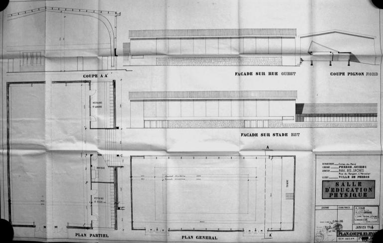 Le projet d'un gymnase en bordure du stade de Perros-Guirec, conçu par J. Gélis et H. Coulombeau, deux architectes parisiens mais très liés à la station balnéaire, fait l'objet d'un arrêté d'approbation technique le 28 mars 1964. Le conseil municipal approuve l'avant-projet définitif le 19 février 1965. L'opération est décomposée en deux tranches : la première bénéficie d'une subvention de 168 000 F au taux de 75% le 1er avril 1966, la seconde de 127 350 F au taux de 45% le 12 juillet 1967. L'ensemble est soldé en 1970. Les mêmes architectes dotent simultanément le stade voisin de tribunes. Une structure artificielle d'escalade est aménagée en mezzanine en 1998. Une rénovation de l'équipement est programmée pour 2020.