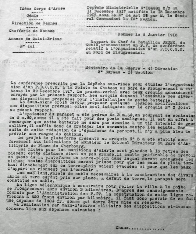La Dépêche Ministérielle n° 14 ATC 27 en date du 18 décembre 1917, prescrit de réorganiser la position de batterie par l’installation de 2 canons de 90 mm modèle 1881 sur affût de côte modèle 1879. Ils sont équipés d’un frein "Marine" qui fonctionne avec de la glycérine à 21 degrés. Ces matériels seront livrés par le Parc d’Artillerie de Saint-Malo. La construction est approuvée par les Décisions Ministérielles du 30 janvier et du 11 février 1918. La plus grande partie des matériaux, ciment excepté, sont à pied d’œuvre ; mais fin mai 1918, les travaux ne sont pas commencés. Le Chef du Génie de la Subdivision de Saint-Brieuc, en réfère à la pénurie de wagons-tombereaux de la Compagnie des Chemins de fer des Côtes-du-Nord. D’où, la difficulté qu’il éprouve à faire transporter ce liant indispensable à la construction des plateformes de tir. La Marine a consenti au Génie de Saint-Brieuc, un prêt de 8 tonnes de ciment, pour lui permettre d’entreprendre immédiatement les travaux d’achèvement du poste de Plougrescant. L’acheminement est effectué par voie ferrée avec livraison en gare de Tréguier. le transport de ces 8 tonnes de ciment à la Pointe du Château s’effectue par voie routière avec les camions du Centre d’Aviation maritime de Tréguier-Plouguiel. Les agrégats nécessaires à l’édification des divers abris et murs sont prélevés sur place. Des niches pour les coups d’alerte sont aménagées dans un terre-plein en queue de plateforme. Les servants sont protégés par un parapet de 0,80 mètre d’épaisseur.