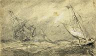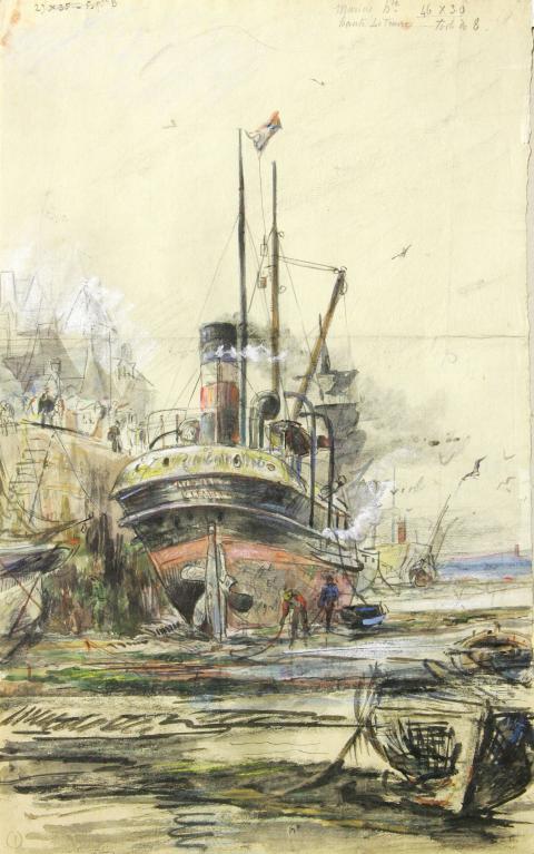 C’est davantage la vie grouillante des quais et des estrans qui séduit la riche palette de l’artiste, les scènes portuaires qu’il croque sur le vif, sur le motif, en utilisant ce que le douanier en exercice a sous la main : feuille de papier quadrillé, imprimé des douanes, morceau de carton, où il va rapidement esquissé et mettre en couleur telle manœuvre sous voiles, le halage d’une lourde embarcation, le déchargement d’une galéasse avec son mât de charge, les échouages dans la glaise bleue des grèves, les postures, les attitudes des marins…