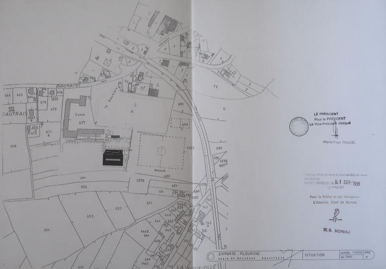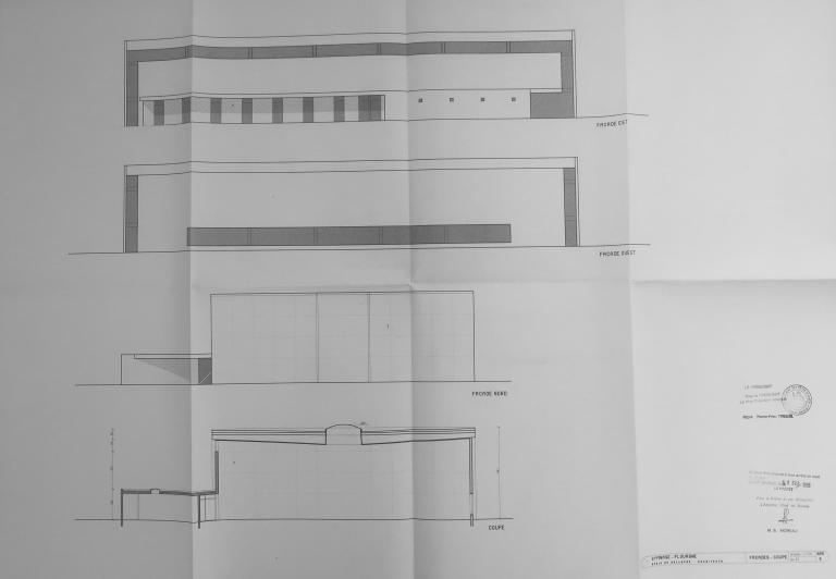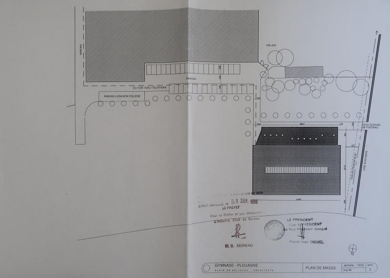 - Le gymnase proprement dit qui nécessite une hauteur sous poutre de sept mètres aura donc une hauteur hors tout équivalente au collège (R + 2). Traité en matériaux gris, il reprend les tons du collège pour minimiser son impact visuel. L’ensemble est également allégé par l’acrotère plus foncé et les vitrages.
