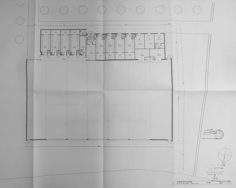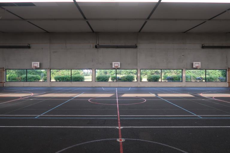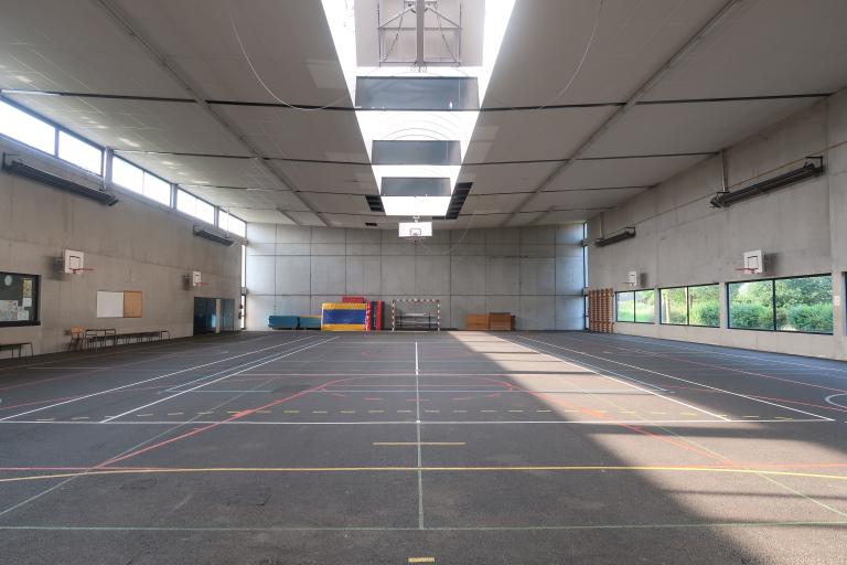 - Les annexes, d’une hauteur de trois mètres environ, forment un premier plan côté est, devant le gymnase sur sa façade d’arrivée. Une touche claire marquera ce rez-de-chaussée aux volumes plus découpés avec ses auvents marquant les différentes entrées.