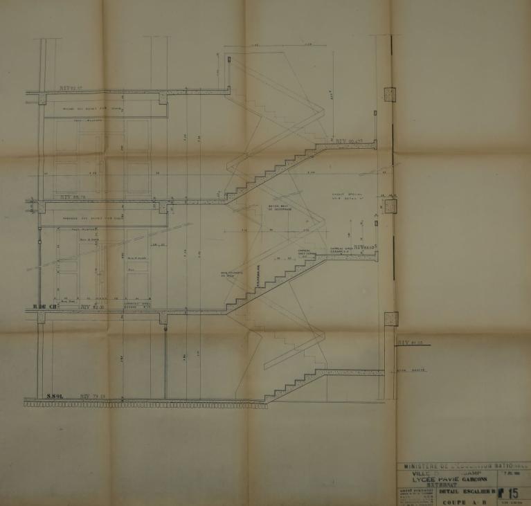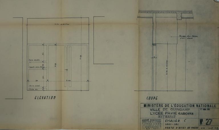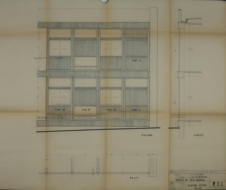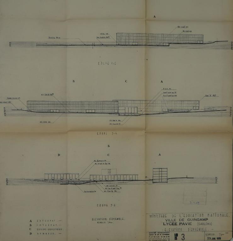 En juillet 1955, l'architecte Henri Guibout propose ses services au maire, en association avec l'architecte André Remondet, déjà à l'ouvrage pour la construction du lycée de jeunes filles de la ville (aujourd'hui collège Jacques Prévert). Le directeur du second degré au ministère, Jacques Brunhold, rappelle au maire que, dans la mesure où le financement de la construction est assuré à 100% par l’État, il revient au seul Conseil général des bâtiments de France (C.G.B.F.) de désigner les architectes. C'est chose faite, par arrêté dudit conseil, le 20 février 1957. Si André Remondet, architecte en chef des bâtiments civils et palais nationaux est bien retenu, il est associé, non pas à Henri Guibout, mais à Patrice Simon, alors architecte ordinaire des bâtiments civils et palais nationaux. Le financement à 100% par l’État, peu courant, est ici justifié par le fort engagement de la ville dans la construction du lycée de jeunes filles. Le statut du lycée à construire évolue cependant. En 1958, dans un courrier de l'inspecteur d'académie daté du 1er août, il est question d'un "lycée mixte".