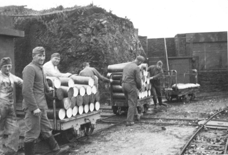 - Photographie de l'un des canons de 164,7 mm de la batterie de Kerbonn par Jean Manzon à l'occasion de la visite à Brest de journalistes américains en 1940 : chargement du canon, Images Défense
