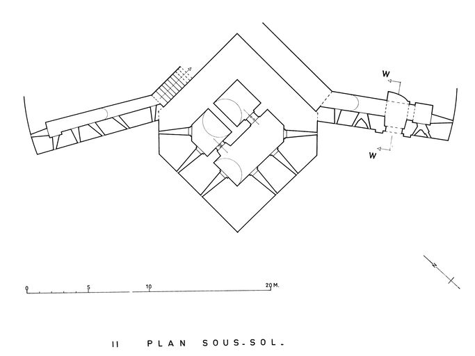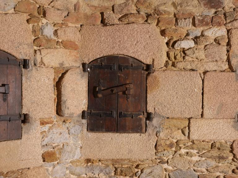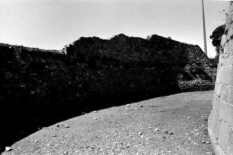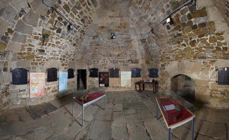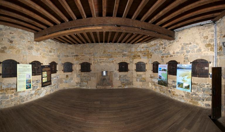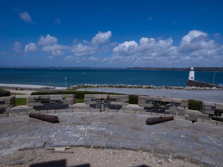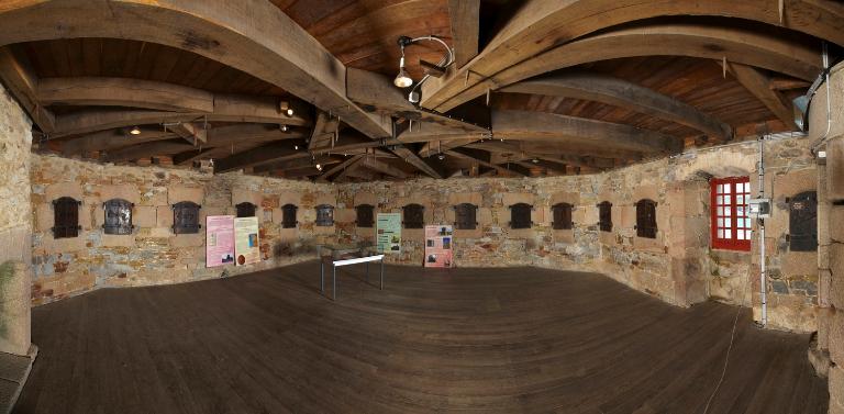 Sur le dallage de la plate-forme, on décèle les traces en arc de cercle permettant le guidage et la rotation des affûts sur roulettes du XIXe siècle.