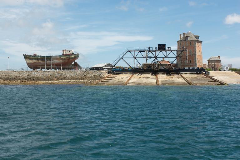 Les travaux débutent en 1689-1690 par la réalisation d´une chaussée empierrée sur le sillon : un simple banc de galets et de sable (aujourd´hui fortement anthropisé) sur lequel avait été édifiée au début du XVIe siècle la chapelle de Notre-Dame-de-Rocamadour. Les fondations de la batterie et de la tour obligèrent à d´importants travaux d´affouillement afin d´asseoir les maçonneries sur le roc. Le fossé mesure 3,2 m de large à la gorge et 5,8 m de large autour de la batterie. Son creusement à 2,9 m correspond à la norme vaubanienne pour les redoutes (1,9 m pouvant être inondés au maximum à marée haute de fort coefficient).