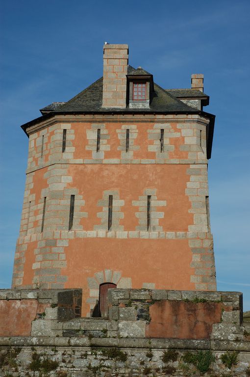 Des créneaux de mousqueterie de type archère percés tout autour de la tour carrée à pan coupé (et même à l´intérieur des cheminées pour éviter les angles morts) concourent à la défense rapprochée de l´ouvrage : "La figure qui leur convient le mieux est la carrée mais quand il s´agit d´en bâtir sur quelque embouchure de rivière, petits ports ou échouages, on peut émousser un de leurs angles directement tournés à la mer pour pouvoir loger quelque trois ou quatre pièces dessus". Les angles d´attaque de la tour, respectivement situés au nord-est vers la mer et au sud-ouest vers l´anse de Camaret, sont fuyants afin de dévier boulets et mitrailles (sur le flanc nord, des impacts de boulets témoignent de la bataille de Camaret, le 18 juin 1694). Le plan de la tour de 1722, signé de l´ingénieur Robelin, indique également la "tour dont on a rétabli les couvertures et supprimé quatre grandes lucarnes". Suite à une restauration "à l´identique" (du plan de 1696 !) de la charpente en chêne massif et de la couverture en ardoises, la tour a retrouvé ses quatre lucarnes originelles en 1956.