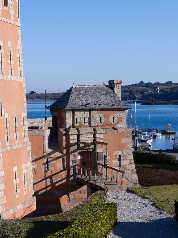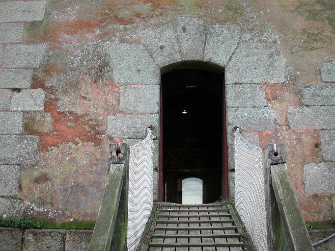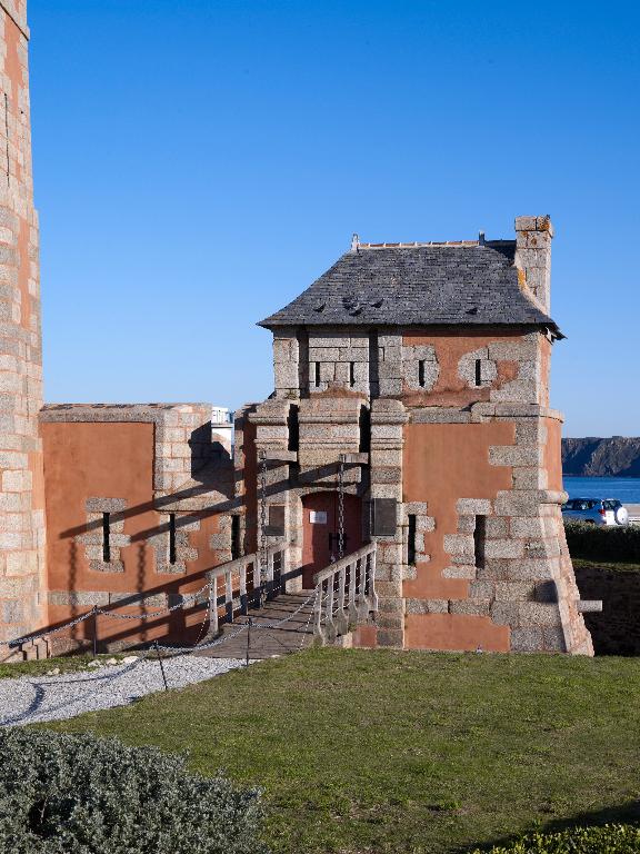 Percé dans la courtine de gorge flanquée d´une galerie de fusillade, le pont-levis à flèches et son pont dormant permettent de franchir le fossé (en eau à marée haute) et d´accéder à la batterie circulaire et au corps de garde défensif doté de 6 créneaux. Un deuxième corps de garde similaire au premier se trouvait à la place de l´actuel four à boulets (construit lors de la période révolutionnaire).