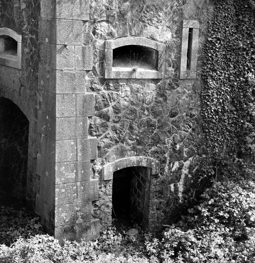 d´angle harpés, piédroits, appuis, linteaux et tablettes, en pierre de taille de granite, soulignent les détails architecturaux. Le fort, centre secondaire de la défense contre avions de la base aéronavale de Lanvéoc-Poulmic, a été violemment bombardé durant la Seconde Guerre mondiale. Situé dans le périmètre de la gendarmerie maritime de Crozon, il est aujourd´hui inaccessible. Les deux caponnières doubles et une partie du fossé sec (au sud) sont inondées.