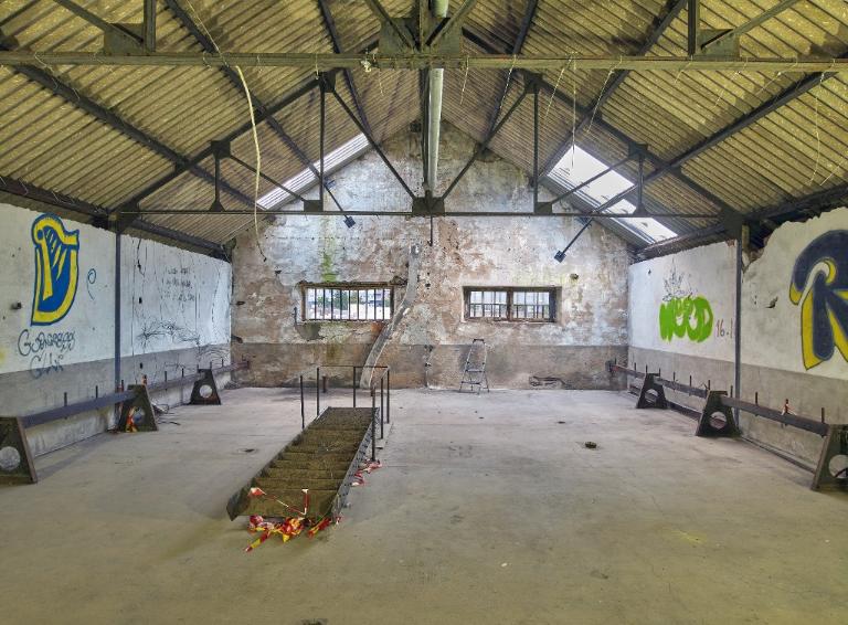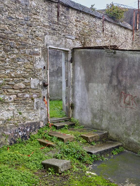 - Premier étage (deuxième niveau) : il est voûté en moellon ; le sol est en dalle de granite. A l’est, petites fenêtres à linteau en arc segmentaire avec grilles ; à l’ouest (de plain-pied par rapport à la cour de promenade), deux portes avec imposte et six fenêtres à linteau en arc segmentaire avec grilles. Au-dessus de la cuisine, se trouvait une salle double à usage de chambre du conseil ou de justice. Deux couloirs - vestibules desservaient à l’origine la cour ouest (troisième et sixième travées) : le vestibule est en place dans la troisième travée depuis le sud avec son banc en pierre au sud ; la sixième travée est transformée en douches mais a conservé son banc en pierre au nord.