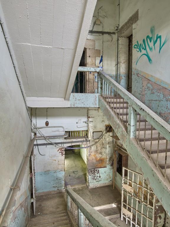 L’élévation ordonnancée à huit travées est vraisemblablement héritée de l’ancienne fonderie. Chaque pièce correspond à une travée. Côté est et côté ouest se trouvent ainsi une série de huit pièces séparées par un couloir de de 3 m de largeur assurant la distribution horizontale. Pour rappel, le bâtiment compte d’abord trois niveaux (1810), puis quatre niveaux (surélévation de 1858-1858), puis cinq niveaux (surélévation de 1936). La distribution de la prison n’a eu de cesse d’évoluer en 179 ans de fonctionnement.
