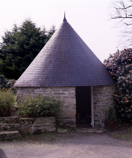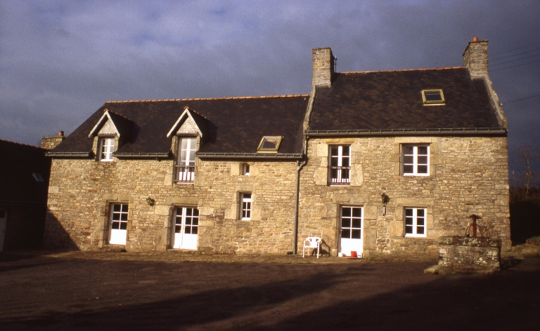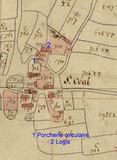 Ensemble construit en 1677. Baies remaniées à l'époque contemporaine. Escalier extérieur en maçonnerie disparu. Toit à porcs (porcherie circulaire) figurant sur le cadastre de 1818.
