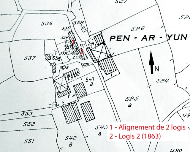 Alignement de deux logis à avancée avec chacun une grange attenante, une au nord, l'autre au sud. Le logis nord était accessible depuis la façade postérieure ouest, le logis sud par la façade principale est. Bel appareil de la façade postérieure présentant tous les types de pierres de construction des Monts d'Arrée (granite, schiste et quartz).