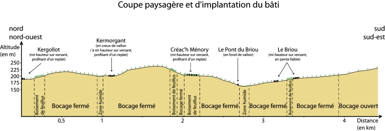 L'implantation isolée est rare et semble relativement tardive, de toute vraisemblance postérieure à 1800. La majorité des édifices se situe au sein de villages de structures plus ou moins éclatées et, à l'origine, composés de plusieurs exploitations agricoles disposant chacune de dépendances et donnant sur des espaces ouverts ou des voies de passage. Trois, six, voire plus de fermes, avec leurs logis exposés indifféremment au sud, à l´ouest ou même au nord, forment des unités disposées d'une manière spontanée et dense (Bouillard, Créac´h Ménory, Kerbriant, Kermorgant, Quillien). Cette organisation spatiale de l'habitat ancien aggloméré, présente sur la totalité du territoire communal, est corroborée par des densités démographiques importantes.