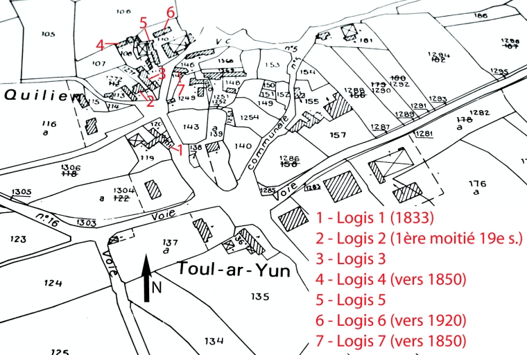 La morphologie du village découle de la forme d'implantation héritée de l´époque médiévale (quévaise). La configuration du hameau, éclaté en cinq ou six noyaux séparés par des chemins, n'a que peu évolué depuis 1837. Il ne reste plus une seule exploitation agricole parmi les sept ou huit ayant existé. Logis 2 probablement de la 1ère moitié du 19e siècle. Logis 1 et 3 datés respectivement 1833 et 1838. Une inscription sur le linteau de la porte du logis 3 donne les noms des commanditaires. Logis 4 et 7 probablement construit vers 1850. Logis 6 construit vers 1920.