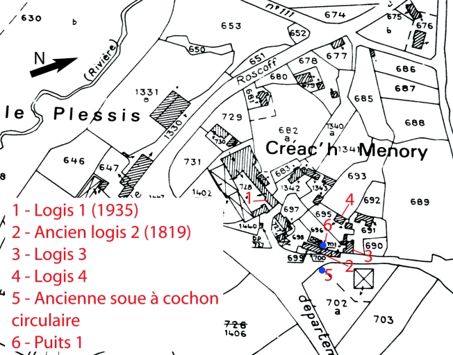 Logis 6 : disparition d'un escalier de distribution extérieur donnant accès à l'étage ; une pierre insérée dans la maçonnerie de l'avancée porte la date de 1711, une croix et l'inscription IHS. Dans la partie sud-ouest du hameau, on voit encore l'emprise au sol d'une ancienne soue à cochon de plan circulaire à l'origine couverte de genêts.