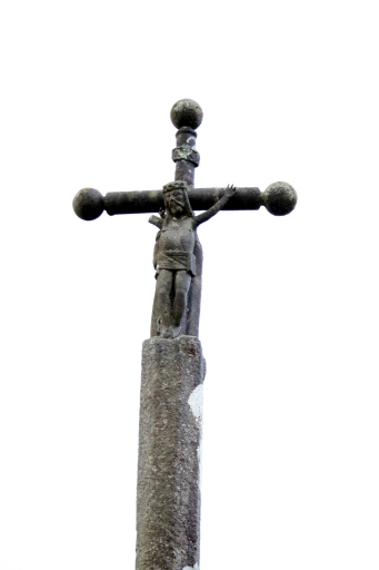 Face nord : Christ en croix. Face sud : Vierge à l'Enfant. Réalisation en granite, à l'exception des parties sculptées, en kersantite.
