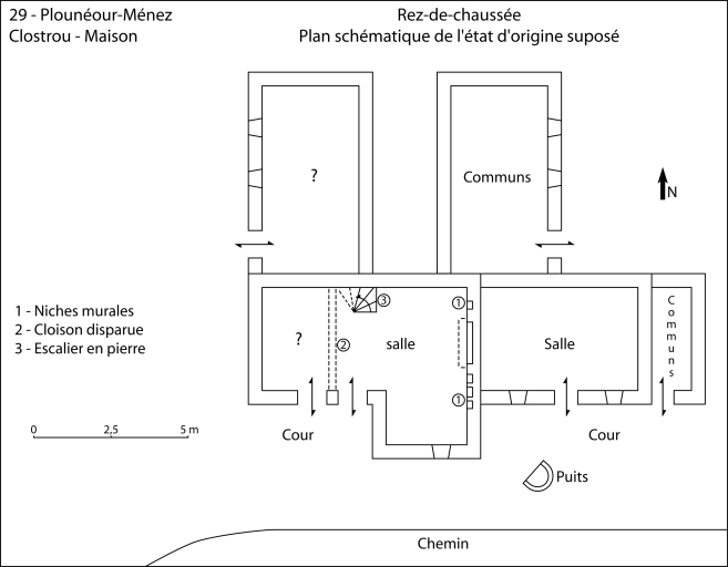 Logis ouest : espace du rez-de-chaussée à l´origine séparé par une cloison (écurie ?) ; cheminée monumentale en granite entourée de nombreuses niches murales ; escalier en vis placé dans l´épaisseur du mur, en pierre dans la partie inférieure, en bois dans la partie supérieure ; pièce à feu à l´étage (cheminée monumentale en granite, souche disparue) éclairée par deux petites fenêtres percées dans le pignon et surmontées de larmiers en granite. Puits semi-circulaire couvert de dalles de schiste.