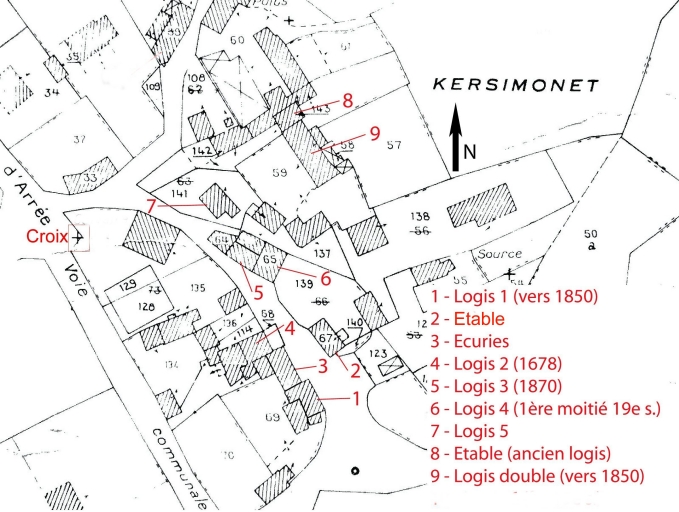 Proche de l'ancienne route Quimper-Morlaix, l'entrée du hameau est signalée par une croix monumentale légèrement déplacée. Entre le premier cadastre et aujourd'hui, la structure de l'ensemble n'a pas été modifiée. Des nouveaux logis sont construits au cours de la seconde moitié du 19e siècle à la périphérie des trois noyaux existants, au détriment d'anciennes habitation déclassées en parties agricoles. Logis 1 vers 1850. Logis 2 daté 1678, remanié au 19e siècle. Logis 3 daté 1870. Logis 4 probablement 18e siècle puis remanié dans la première moitié 19e siècle. Logis 5 seconde moitié 19e siècle. Logis double vers 1850. Une buanderie existe en 1837 au sud-est du hameau.