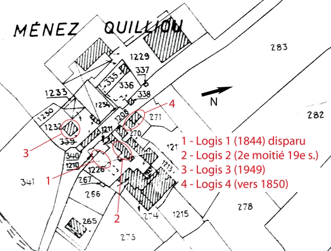 Etabli dès l´époque médiévale, le hameau de Ménez Quilliou (aussi : Quilliou Ménez ou Quilliouménez dans les documents anciens) faisait partie du domaine de l´abbaye cistercienne du Relec régi par la « quévaise », système de tenure particulier favorisant l´organisation en communautés agricoles. Une buanderie attestée par les archives existait au 18e siècle. Les bâtiments actuellement en place sont tardifs et remaniés. Un logis à avancée daté 1844 a disparu après 1970. Les autres logis ont été reconstruits au milieu ou dans la seconde moitié du 19e siècle. Visible sur une vue aérienne des années 1990, un logis de type urbain (couverture à demi croupe) a été construit en 1949.
