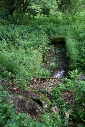 Fontaine couverte en granite alimentant l'ancien lavoir de plan rectangulaire aux parois constituées de grandes dalles de schiste.