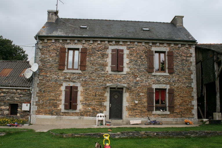 Logis 1 (disparu) : à avancée, présence d'un saloir encastré dans l'épaisseur du mur. Logis 2 : de type ternaire, enduit disparu, corniche, pierres d'angle et encadrement des baies en granite. Puits carré avec superstructure en fer forgé.