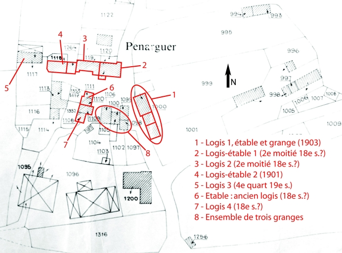 La présence du hameau est attestée dès 1496 (sous le toponyme de Penankaer). Sa structure, en deux parties distantes d'une centaine de mètres (Penarguer bras - Penarguer bihan sur le cadastre ancien) et regroupant sept à huit fermes, n'a guère évolué depuis 1813. Plusieurs constructions de la fin du 19e et du début du 20e siècle sont venues étoffer la partie ouest du hameau (anciennement Penarguer bras). Etable (ancien logis) et logis 4 probablement 18e siècle ; logis-étable 1 et logis 2 probablement seconde moitié du 18e siècle ; logis 3 quatrième quart du 19e siècle et logis-étable 2 et logis 1 respectivement datés 1901 (porte la date) et 1903 (information orale).