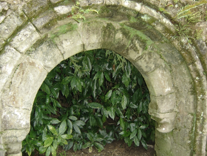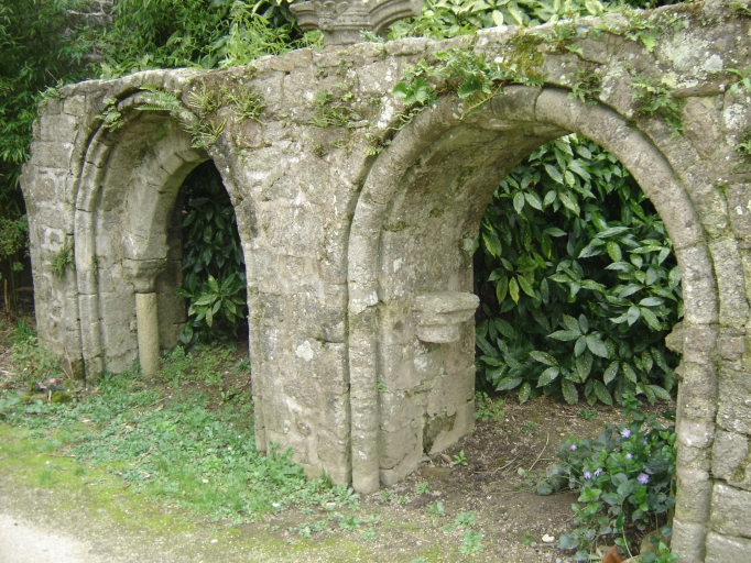 Considérées comme les vestiges du cloître primitif du monastère de Locmaria, ces trois arcades pourraient tout aussi bien appartenir à la façade occidentale de l'ancienne salle capitulaire. Il est rare de trouver des cloîtres de la fin du 12e siècle, période à laquelle il faut probablement attribuer ces vestiges d'après les éléments sculptés conservés, aussi massifs. Par contre, beaucoup de salles capitulaires ont un profil similaire aux trois arcades conservées (c'est le cas, entre autre, de celle de Marcilhac-sur-Célé dans le Lot). Très souvent les salles du chapitre s'ouvrent à l'Ouest, sur le cloître, par trois arcades à plusieurs rouleaux. Les rouleaux intérieurs des arcs retombent fréquemment sur de petites colonnettes engagées sur les faces intérieures des piliers, ce qui est le cas à Locmaria.