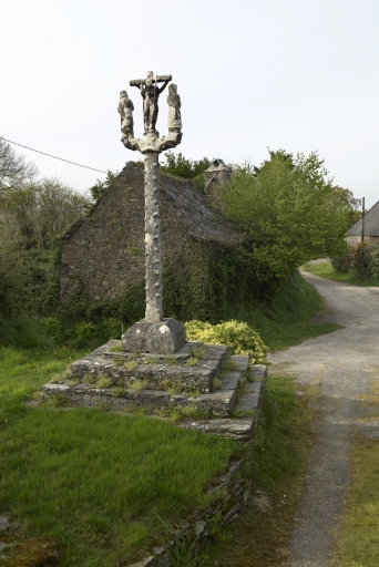 Emmarchement en moellon de schiste à trois degrès ; base carrée à pans, fût à écots en granite ; traverse frappée d'armoiries buchées portant un groupe de la crucifixion (saint Jean, Vierge et Christ en croix) face nord, Christ ressuscité (face sud) en kersantite.