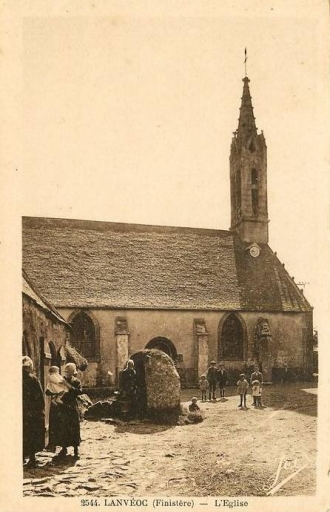 Lanvéoc est érigé en paroisse en 1862 et en commune dix ans plus tard. L'église actuelle a été construite en 1873 en remplacement de la chapelle Sainte-Anne écroulée en 1870 qui se situait à l'emplacement actuel du cimetière. La porte en façade ouest est un probable remploi. Bachelot de La Pylaie fait une description sommaire de la chapelle Sainte-Anne en 1843 : "Au dessus de la porte occidentale on voit une sculpture en granit qui représente une espèce de chien couché à plat ventre et dont les pattes sont en avant." Cette sculpture est utilisée en réemploi dans l'église actuelle.