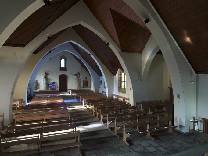 Eglise de plan en croix latine. Sacristie hors oeuvre. Porche sud inclus dans une chapelle jouxtant le bras sud du faux transept. Nef sans bas-côtés éclairée par les baies latérales. Tour carrée avec chambre des cloches accessible par un escalier aménagé dans l'épaisseur du pignon. Flèche polygonale de type cornouaillais percée de gâbles ajourés et flanquée de pinacles. Arc monumental à trois arches en arc plein cintre et arche transversale, arches latérales à échaliers.Tympan flanqué de pots à feu et surmonté de statues géminées rapportées.