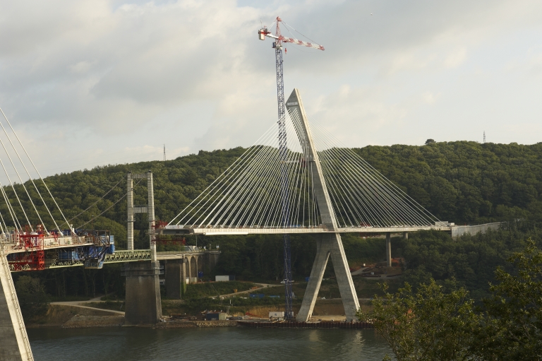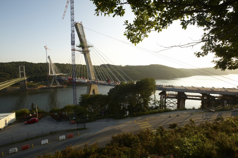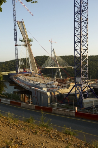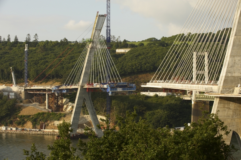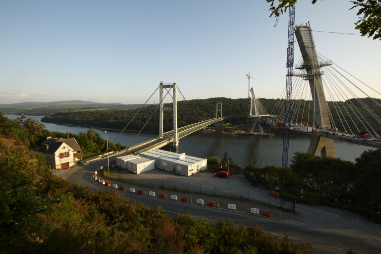 Passage par bac au moins depuis le 18e siècle assurant la liaison entre le Faou et la presqu' île de Crozon. Cales restaurées en 1836 et 1857. Début des travaux de maçonnerie en 1913, interrompus entre 1914 et 1920 et achevés en 1923, d'après les plans de Pigeaud, ingénieur des Ponts et Chaussées et agent voyer du département du Finistère ; travaux réalisés par l'entreprise de maçonnerie Autajon et les établissements Five-Lille pour la superstructure mise en place en 1925. Destruction en 1944 et reconstruction du pont actuellement en service entre 1945 et 1951. Le nouvel ouvrage, premier pont courbe à haubans en France et dont la jonction du tablier terrestre et du tablier suspendu a été achevée en juin 2010, est en cours de réalisation (conseil Général, maître d´œuvre, Charles Lavigne, architecte, Michel Virlogeux, ingénieur en chef des Ponts et Chaussées, Vinci Construction France, réalisation). La mise en service est prévue pour le premier trimestre 2011 (515 mètres de tabliers soutenus par 144 haubans).