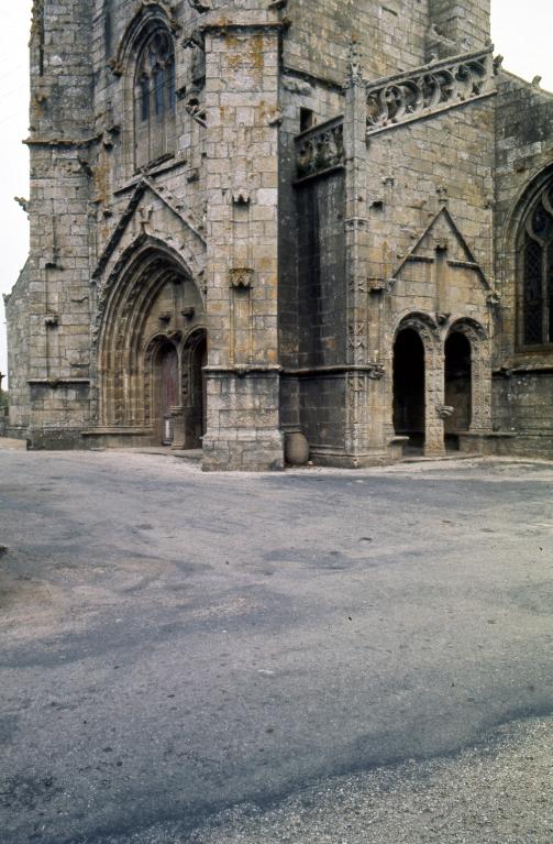 L´édifice est bâti dans un granite gris jaune à muscovite, soigneusement appareillé. Le chevet reprend l´ordonnance tripartite des grandes chapelles du dernier tiers du 15e siècle. Seule innovation, la sacristie, ou chambre du trésor, qui flanque généralement le chœur, est ici adossée au chevet plat. Elle forme une salle rectangulaire médiocrement éclairée. À un toit en appentis qui aurait occulté le bas de la maîtresse-vitre, on a préféré une couverture à deux versants inégaux en dalles de granit portées à l´intérieur par sept arcs-doubleaux en berceau rampant, retombant sur des dosserets. Une balustrade ajourée de cœurs tête-bêche couronne son mur oriental. Les élévations latérales alternent pans de murs bas aveugles et lucarnes passantes, et non la file de pignons perpendiculaires à l´axe de l´édifice dont la vogue culmine autour de 1500 en haute Bretagne. Celles du chœur sont de proportions plus modestes et ne présentent pas la riche mouluration qui encadre les pignons de lucarnes de la nef. Elles portent un décor sculpté où prédomine la thématique maritime. Deux portes en anse de panier surmontées d´une accolade donnent accès respectivement au chœur et à la nef. Les contreforts ne sont pas dans l´alignement des supports intérieurs. Du côté sud, leur couronnement est alternativement taluté et amorti par un pinacle, ou en bâtière. Sans être franchement négligée comme c´est la règle en Bretagne, l´élévation nord est moins richement traitée. Du reste, le bas-côté nord du chœur est dépourvu de lucarnes et n´est éclairé que par deux petites baies au réseau flamboyant : peut-être le chantier a-t-il démarré à cet endroit. Au-dessus de l´arc triomphal, s´élève un clocher central fort élégant, composé d'un clocheton à chambre ouverte coiffé d´une flèche, et encadré par deux tourelles symétriques auxquelles le relie une coursière à garde-corps ajouré de quadrilobes, portée par deux arcs en quart-de-cercle ; dans la tourelle nord débouche un escalier en vis ménagé dans la pile correspondante de l´église. Le parti est inspiré de la chapelle voisine de Tronoën et connaîtra, transposé sur le mur-pignon occidental, un succès durable en Cornouaille.