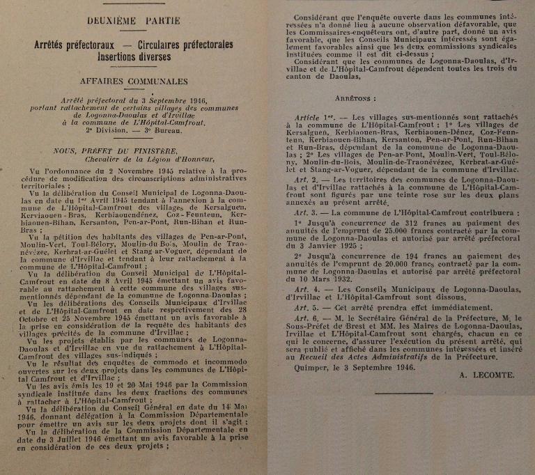 Commune depuis 1795, appartenant à l'arrondissement de Brest, au canton de Daoulas, elle est située sur le territoire de l’évêché de Quimper. Ancienne trève de Hanvec, son érection en paroisse date de 1821. En 1932, la paroisse s'agrandit des hameaux de Logonna-Daoulas (Pen ar pont, Run vras, Run bihan, Coz Feunteun, Kerbiaouen, Denes, Kersanton, Kerslaguen, Goas-creis) et hameaux de Irvillac (Toulbélory, Moulin du bois, Kerbrat, Moulin vert, Stang ar voguer). Administrativement, ces hameaux sont rattachés à la commune de Hôpital-Camfrout le 3 septembre 1946.