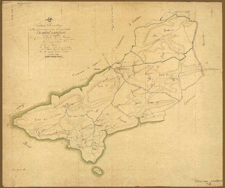 Quant à Ogée, il nous donne ce descriptif : "commune formée par démembrement de plusieurs paroisses limitrophes, et sur l'ancien prieuré du nom de Camfrout ; aujourd'hui succursale. Principales villes : Kerascoët, Villeneuve, Keroulé, Kervéguen. Objet remarquable, le bois du gars. Superficie totale : 1 077 hectares. Terres labourables : 313 ; prés et pâturages : 25 ; bois : 251 ; verger et jardins : 3 ; landes et incultes : 451 ; moulins 2 ; commanderie de l'ordre de Malte ; "le beau granit dit de Kersanton a des gisements dans cette commune.