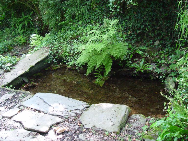 Son bassin, constitué de dalles de schiste, est implanté le long du pignon Ouest et à pour dimensions : 3,30m x 1,85m et 45cm de profondeur. La dalle de scellement est un réemploi de meule courante en granite. Malgré une cassure, on peut observer la trace circulaire du scellement. Elle est placée sur une auge en granite de 1,30m x 0,56m et de 30cm de profondeur permettant de récupérer l'eau servant à la lessive des écheveaux de fils de lin. Une source non maçonnée est située à proximité.