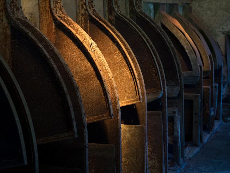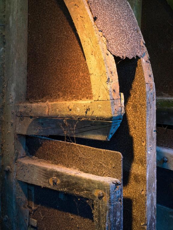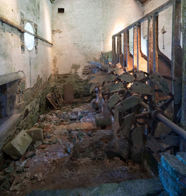 La roue hydraulique du moulin est toujours visible sur le site. Il s’agit d’une roue de poitrine de type Sagebien, du nom de son inventeur, l’ingénieur Alphonse Sagebien, qui conçoit ce modèle en 1850 avant de le mettre en œuvre à partir des années 1860, notamment dans le nord de la France. Contrairement à la roue « en dessous », la roue de poitrine canalise l’eau à mi-hauteur, dans des augets latéraux, ce qui améliore considérablement son rendement. La spécificité de la roue Sagebien réside dans l’orientation de ses pales : elles ne sont pas disposées radialement, mais inclinées de façon à ce que l’aube entre dans l’eau avec un angle d’environ 45°, optimisant ainsi la force motrice exercée par le poids de l’eau, même à faible vitesse. Ce système limite les pertes d’énergie et assure une meilleure efficacité hydraulique. La première roue Sagebien est installée à Ronquerolles (Oise) vers 1860. Celle du moulin de Pont-Pol, bien que non datée précisément, aurait été installée après 1870. À cette date, on ne recense qu’un seul exemple de son utilisation en Bretagne, à Rennes.