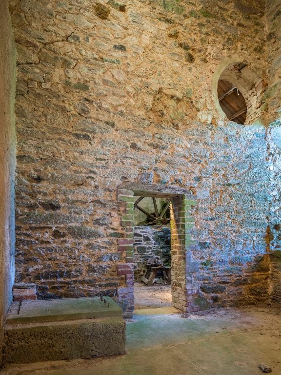 Au sud du bâtiment, un espace laisse supposer l’existence d’un bassin, possiblement lié à la blanchisserie attenante au moulin. La toiture de cet espace a aujourd’hui disparu et la forte végétation ne permet pas de confirmer avec certitude cette hypothèse. À l’intérieur, une partie du mécanisme d’origine subsiste : roues et dispositif de teillage sont encore en place, malgré le rachat du site par des particuliers.