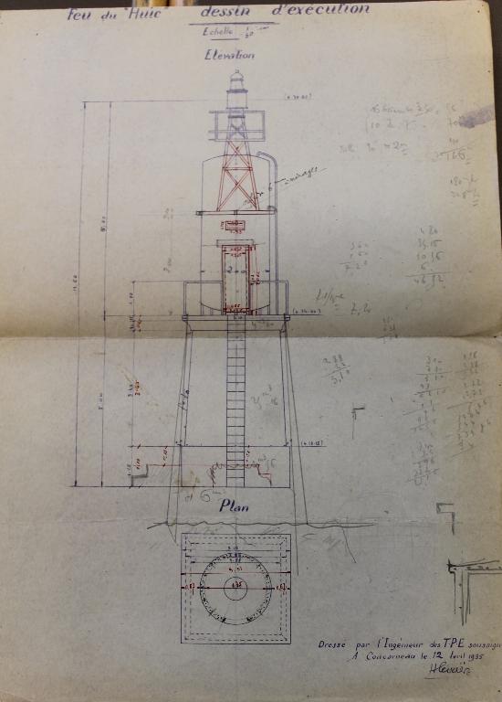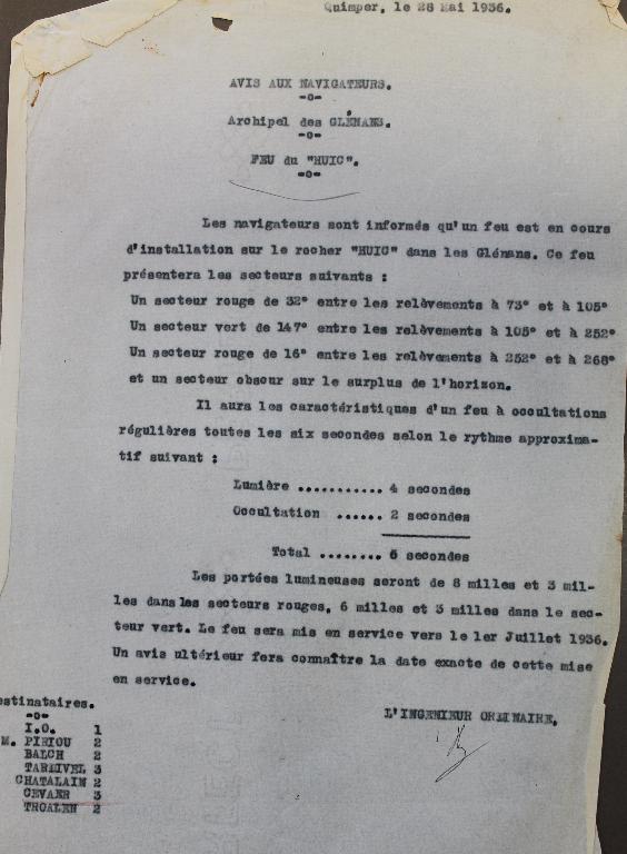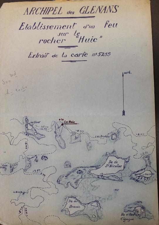 Feu désaffecté du Huic, situé au nord de l'île St Nicolas de l'archipel des Glénan. Ce feu a été construit en 1935 et mis en service le 1er juillet 1936 à la demande de la Marine Nationale. Un accord financier est prévu pour la construction du feu. Dans une lettre du 26 septembre 1936, il est écrit qu'une décision ministérielle du 14 mars 1935 a approuvé le projet de construction d’un support de feu sur le rocher « Huic », dans l’archipel des Glénan. Un avis aux navigateurs daté du 28 mai 1936 informe qu’un feu est en cours d’installation sur le rocher « Huic » dans les Glénan. Ce feu présente les secteurs suivants : un secteur rouge de 32° entre les relèvements à 73° et à 105°. Un secteur vert de 14, 7° entre les relèvements à 105° et à 252°. Un secteur rouge de 16° entre les relèvements à 252° et à 268° et un secteur obscur. Il aura les caractéristiques d’un feu à occultations régulières toutes les six secondes selon le rythme approximatif suivant : lumière 4 secondes, occultation 2 secondes. Les portées lumineuses seront de 8 milles et 3 milles dans les secteurs rouges, 6 milles et 3 milles dans le secteur vert. Le feu sera mis en service vers le 1er juillet 1936.