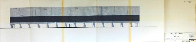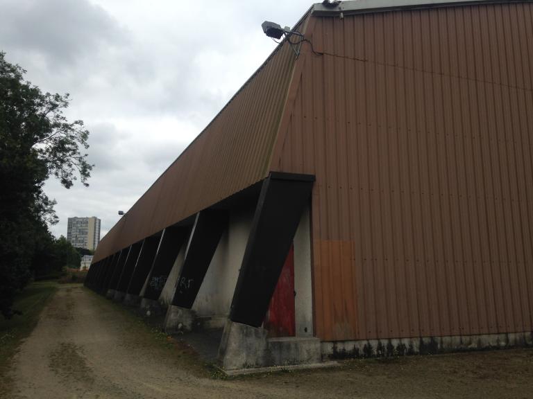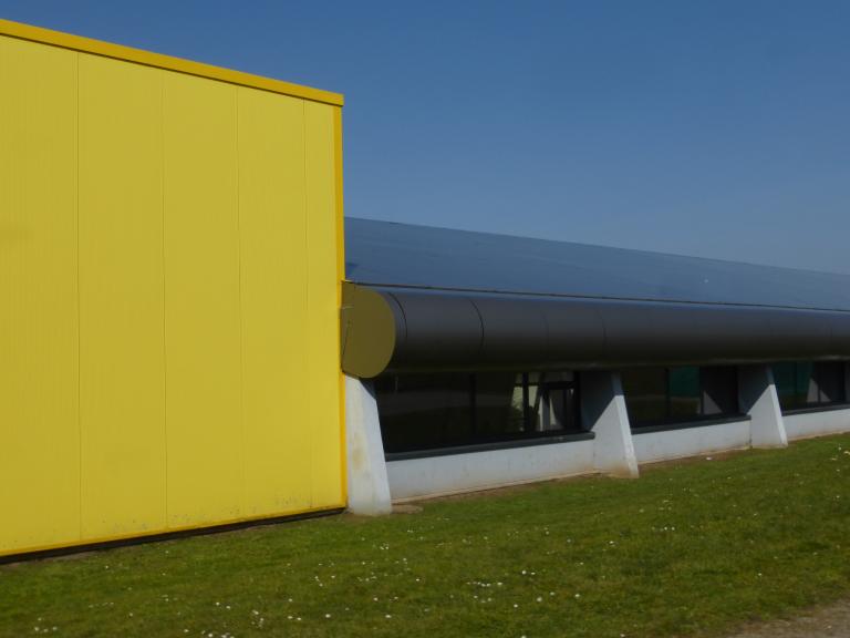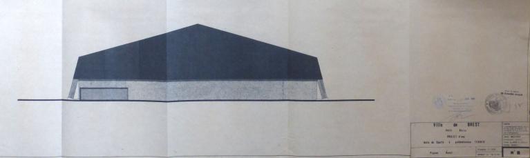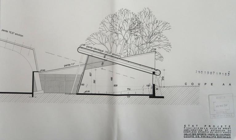 Créé dans les années 1960, le "centre sportif scolaire du Petit Kerzu" a été complété récemment par la construction d'une piste de vitesse couverte de qualité, dont le projet "a avant tout fait l'objet de la recherche d'un volume compatible avec la masse imposante et quelque peu austère du gymnase existant. Aussi avons-nous proposé la création d'un bâtiment monopente dont le traitement de toiture en tôle d'aluminium lisse [...] devient l'élément essentiel de la composition. Tracée en parallèle de la toiture de la grande halle, celle-ci vient mourir contre un terrain planté ne laissant apparaître qu'une fente lumineuse au sud. Ce traitement architectural permet ainsi de minimiser l'impact dans le paysage du gymnase existant. L'essentiel de l'éclairage naturel est pris en façade nord, ceci afin d'éviter les effets d'éblouissement et de profiter de l'abri au vent créé par la grande halle (minimisation des déperditions thermiques). L'ensemble est conçu en charpente métallique venant prendre appui sur le mur de soutènement du talus créé. Un volume laqué de couleur vive vient à contre-pente rompre la monotonie des toitures : il signale depuis l'accès au site l'entrée de l'équipement, il abrite aussi les équipements techniques (traitement de l'air, etc.)." (Note de présentation, 2007)