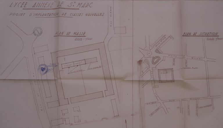 Les études de celle-ci étaient d'ailleurs bien engagée, puisque le ministère avait nommé, dès 1961, l'architecte jean Lacaille, pour mener à bien cette opération. La Ville étudiait depuis le printemps la délégation de maîtrise d'ouvrage à l'Etat. Le compte-rendu de la visite de l'ingénieur attaché au rectorat, le 18 avril 1963, en présence de l'adjoint au maire délégué à l'enseignement, M. Holley, précise en effet les avantages de cette formule pour la commune (participation forfaitaire, insensible aux éventuels surcoûts, de "2 à 3 millions de francs", sur un total de 10 millions) et indique : "M. Lacaille sera confirmé dans sa mission. (...) Le Ministère de l'Education Nationale ayant procédé à un concours dit "Conception - Réalisation", il est probable que le lycée de Saint-Marc sera adapté à partir de plans-types, en fonction du terrain et du programme." Le 22 avril 1963, le Conseil municipal délibère dans ce sens. Le programme technique est arrêté le 27 juillet 1963, sur la base du programme pédagogique du 20 juin de cette année-là.