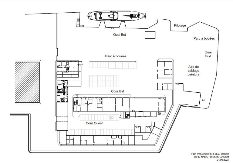 Les bâtiments sont implantés sur le pourtour d'une parcelle créant deux cours ouest et est, un parc à bouées et une aire de sablage et de peinture.