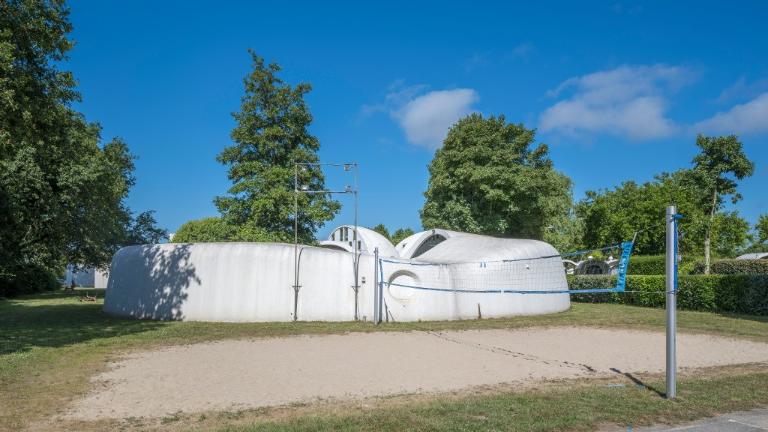 Le plan masse s’ouvre au sud-ouest sur le déambulatoire : un vaste anneau de verre enroulé autour d’un noyau cylindrique regroupant secrétariat, bar et bibliothèque. Deux salons à l’usage des adultes flanquent ce premier volume sur ses faces est et ouest : déployés sous le volume de deux demi-sphères, ces pièces sont percées de trois cheminées cylindriques de diamètres différents. Les deux plus grandes servent de « canon à lumière » et la plus étroite de conduit pour la cheminée autour de laquelle se rassembler.