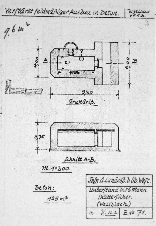 Ce bunker a été construit par l’Allemagne nazie sous maîtrise d’ouvrage de l’Organisation Todt en 1943-1944. Il était classé comme VF, verstärkt feldmässiger Ausbau in Beton qui désigne une construction de campagne renforcée en béton.